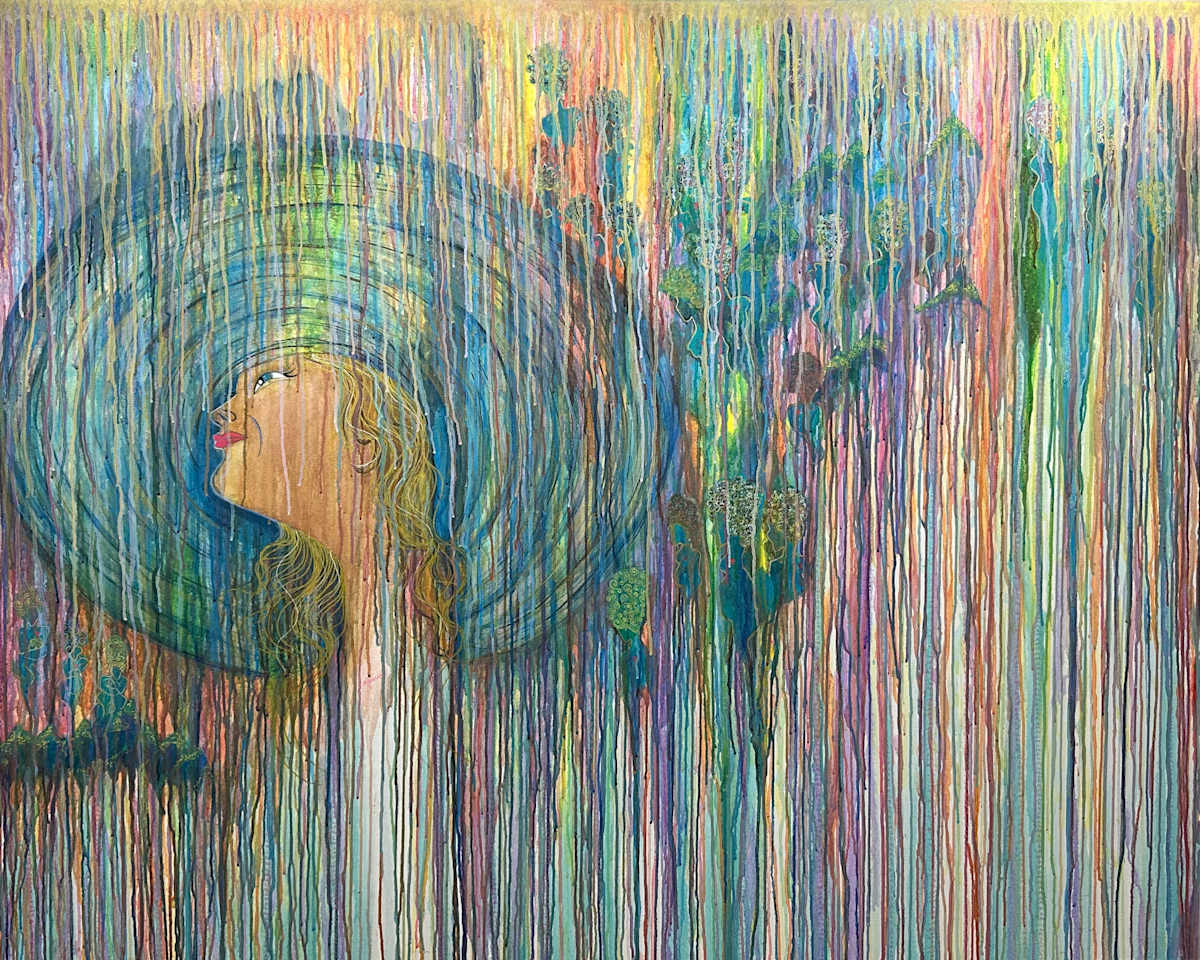 Created using a variety of pigments from acrylic paint, watercolor, inks, bubbles, and soap, allowing the media to drip down the surface of the canvas, this piece came together over many years during the journey of adoption. Inserting oneself into a timeline that has unfolded through hundreds of years, one person is an insertion in a vast timeframe, an interruption in a chain of events unfolding. To keep the lifeline continuing, a circle of life and a march of motherhood that will love going forward, whiteness interrupted. In Haiti, there are mountains beyond mountains, and in this journey, life will continue. Love will love again, and children will grow up and have their own children, and the cycle of life will grow and regrow. Mothers will give birth, and children will have the mothers of their past looking from over their shoulders, fondly, with love. The interruption of whiteness to help the cycle continue may or may not matter at some point, for it will continue. So long as there are children after children, the mountains beyond mountains will be climbed with the help of every mother who came before.
